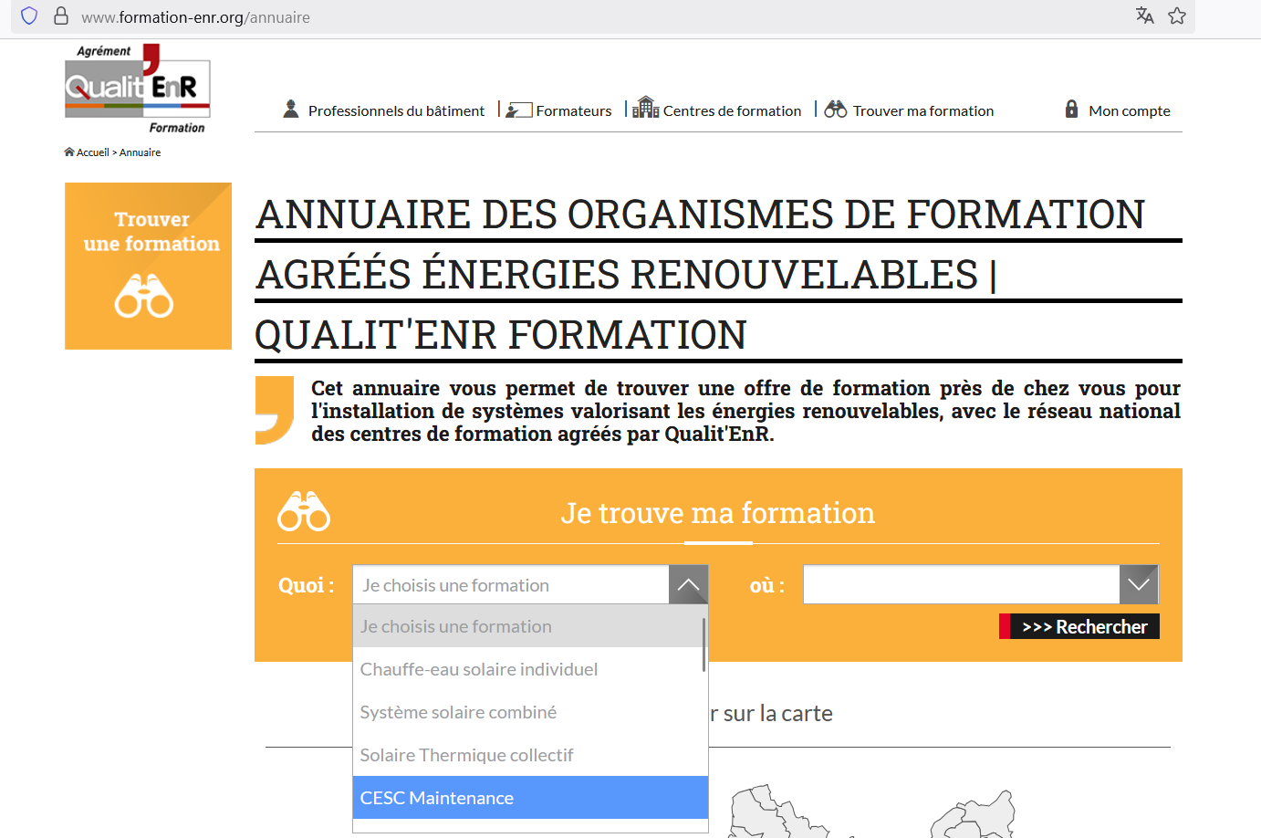 - La formation SOCOL exploitants permet à l’exploitant de bénéficier d’une formation spécialisée en chaleur solaire collective. Afin de trouver un centre de formation agréé, effectuez une recherche sur la formation CESC Maintenance sur la page https://www.formation-enr.org/annuaire :