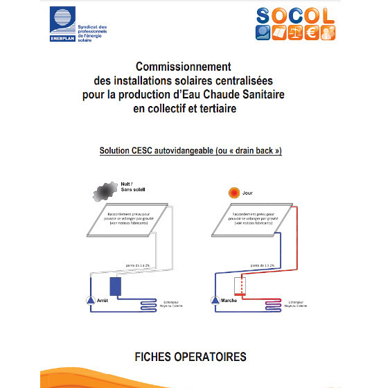 Utiliser le Guide du commissionnement SOCOL si une démarche de commissionnement est souhaitée. Le commissionnement permet d'obtenir une traçabilité à chaque étape du projet ainsi qu'un engagement des professionnels impliqués, depuis la conception et tout au long de la vie de l'ouvrage : mise en œuvre réception, réglage et exploitation. Le commissionnement implique une garantie de moyens pour chacun des acteurs participant à la construction de l’ouvrage. Cette démarche doit s’accompagner d’un suivi du fonctionnement de l’installation solaire. Si cela est possible, il convient d'impliquer l'exploitant dans le projet et ce, dès la phase de conception. Un guide du commissionnement a donc été élaboré par les experts du groupe de travail SOCOL. Il propose un document pédagogique expliquant la démarche du commissionnement, ainsi que des livrets composés de fiches opératoires, permettant de mettre en œuvre la démarche.