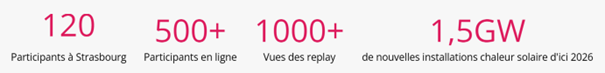 Cette 10è Edition a rassemblé 120 participants en présentiel et 530 en ligne : un record ! Vous êtes de plus en plus nombreux chaque année, cette participation témoigne de la dynamique du marché et de l'engagement croissant en faveur du solaire thermique. Un moment inspirant, plein de rencontres et d'idées innovantes pour accélérer la décarbonation grâce à la chaleur solaire ! Le constat est partagé: il faut changer d'échelle, avec une planification sectorielle en lien avec les territoires. Cette journée a été l'occasion de s'inspirer des bonnes pratiques de chacun, pour en faire émerger des solutions pour tous. Multiplier le marché par 7 : c'est possible, et grâce à ces Etats Généraux de la Chaleur Solaire, nous avons toutes les clés en main pour y arriver !